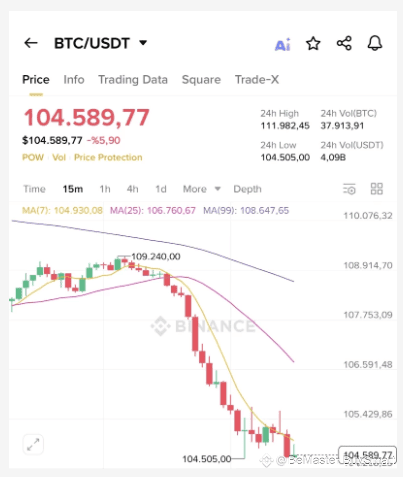 The move came alongside a viral tweet from Mr. Crypto Whale, who highlighted the breakdown and announced a 1 BTC giveaway (worth over $100,000) to a random follower. The BTC/USDT chart on Binance reveals a clear shift in momentum. After hitting a peak near $109,240, Bitcoin dropped almost 6% in 24 hours, bottoming out around $104,505. The price is now sitting below three key moving averagesโthe 7-day, 25-day, and 99-dayโwhich suggests sellers are in control. Resistance has formed around $106,700 to $108,900, while support is holding near $104,500. If that breaks, the next real floor could be closer to $103,000, with $100,000 not far behind.