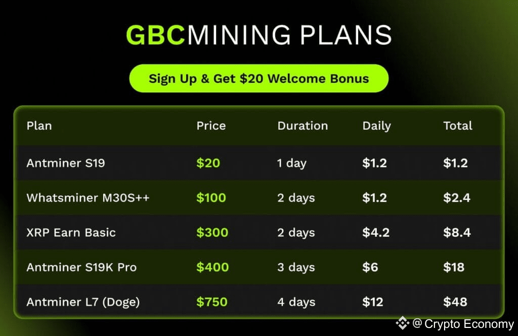 Step 1: Register and Claim Your Bonus Head to gbcmining.com and register your account. Claim your $20 Welcome Bonus immediately to launch your first test contract, such as the entry-level Antminer S19.