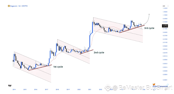 Cycle 1 (2014–2017): After years of sideways movement in a downward channel, DOGE broke out in 2017, launching its first major bull run alongside the broader crypto boom.