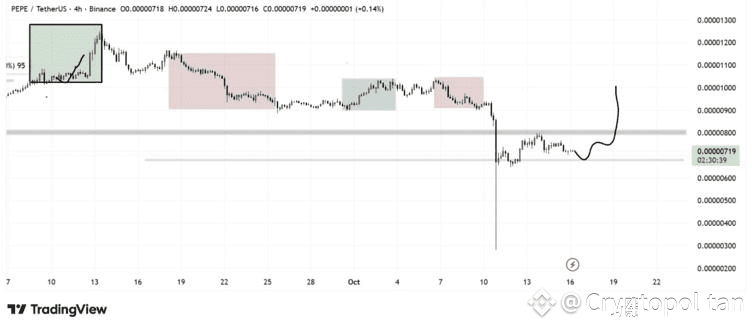Pepe Coin (PEPE) has dropped precipitously, sitting at around $0.00000719 but above a critical accumulation area following a 25% decline. The chart suggests that buyers are protecting this support, paving the way for a reversal if momentum is maintained. A push above $0.0000080 can trigger a robust breakout towards $0.0000100, and failure to hold support around $0.0000065 can postpone recovery and prolong bearish pressure.