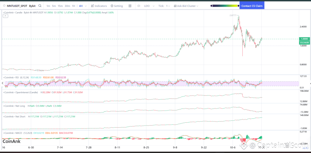 The 4H chart paints a clear picture, MNT price has bounced off a strong support area around $1.45, forming a sharp V-shaped recovery. The price is now hovering near $1.88–$1.90, which is acting as resistance in the short term.