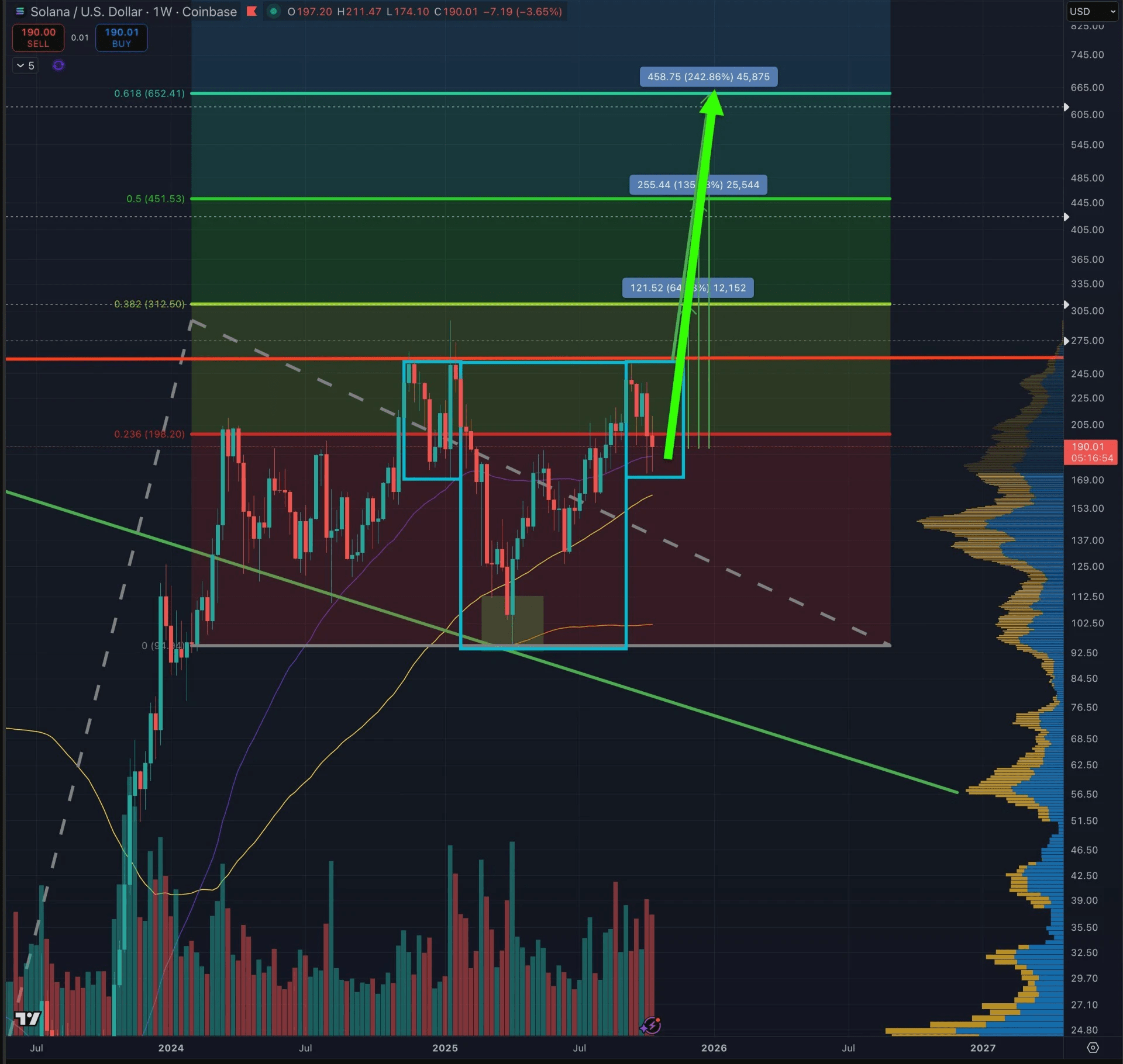 The Parabolic Target (at $600+): Micro2Macr0 looks at the big picture (the weekly chart) and says: "The long-term structure is mega-bullish". According to the "measured move" calculation, once we finish this consolidation (the price being still before a big jump), we could see peaks above $600 🤯. The key resistance levels that separate us from that sky are $265 and $451. If $SOL it can firmly hold above $250, the path is clear for a potential 240% rise by the end of 2025! 🤑