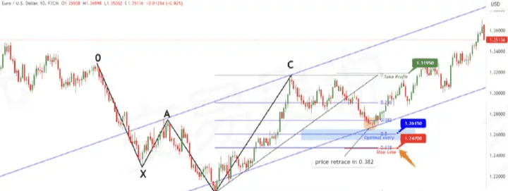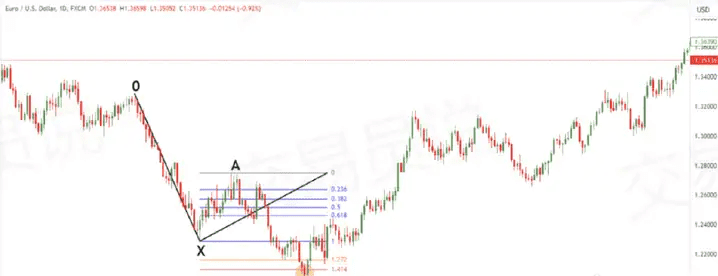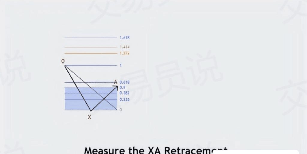 ●XA: The retracement of the 0X wave, usually near the 38.2% to 50% Fibonacci retracement level.