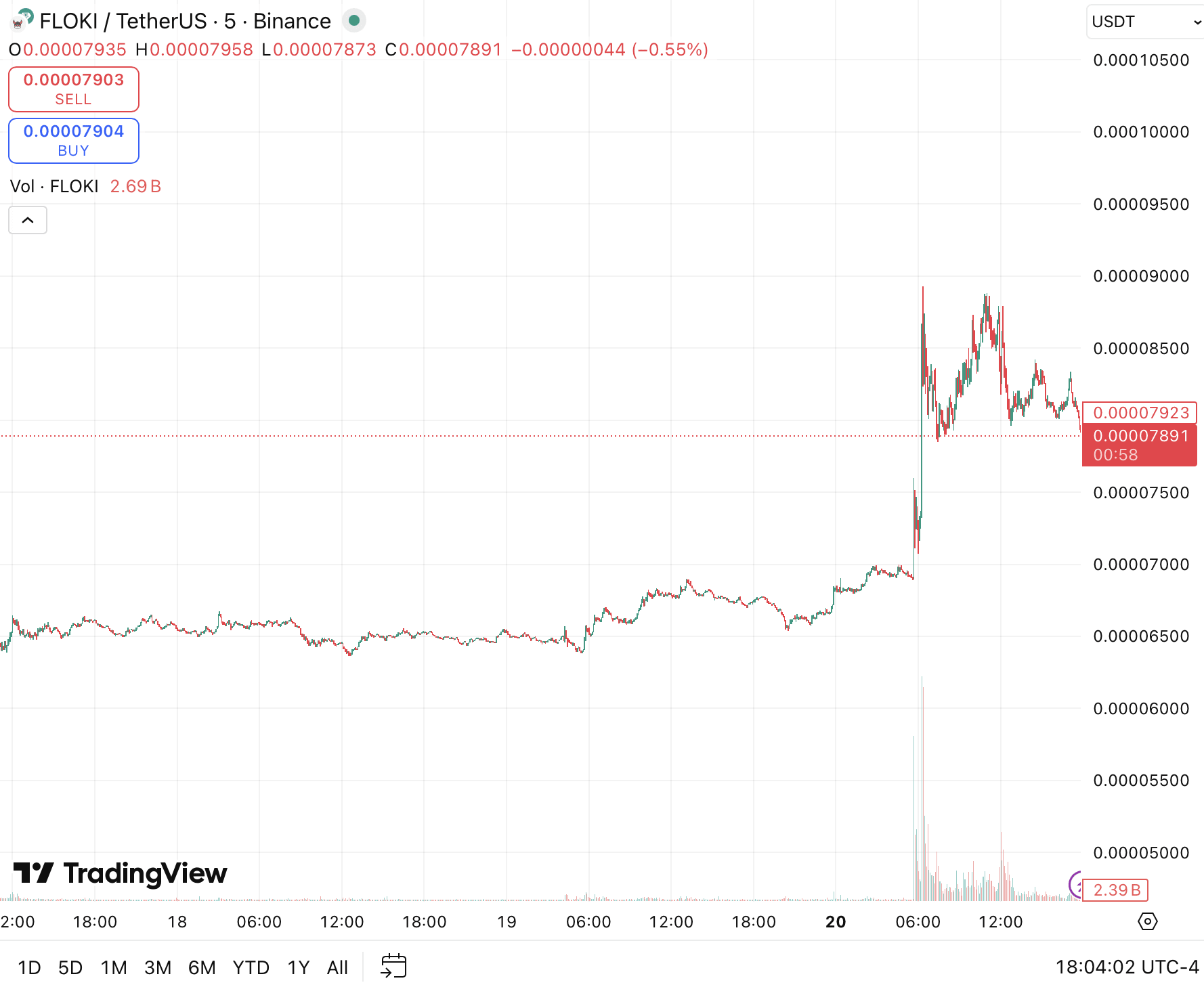The post went viral in a matter of minutes, raising the price of FLOKI, the token inspired by Musk's pet, by more than 20% to $0.00008043, according to TradingView. Trading activity surged after the token briefly topped the CoinGecko trending list: the volume of derivatives trading skyrocketed by 663% to $283 million, and open interest rose by 165% to $37 million, according to Coinglass data.