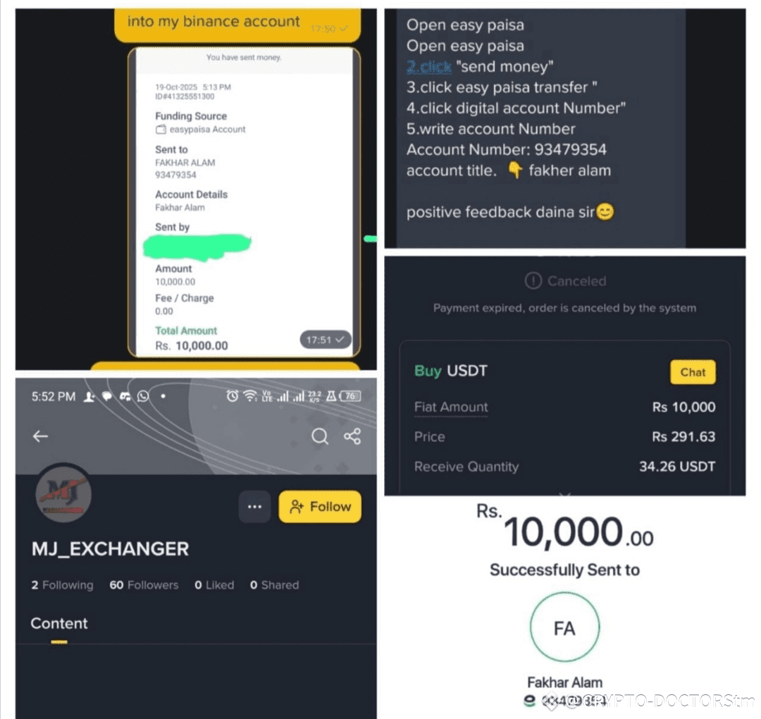 A serious warning has been issued for Binance users in Pakistan, where a fraudster, posing as a reputable crypto exchanger under the name “MJ_Exchanger,” is deceiving users and collecting money from them. However, no funds are being transferred to Binance accounts in return. According to an affected user, he sent money to this fraudulent exchanger via EasyPaisa, the details of which are as follows.