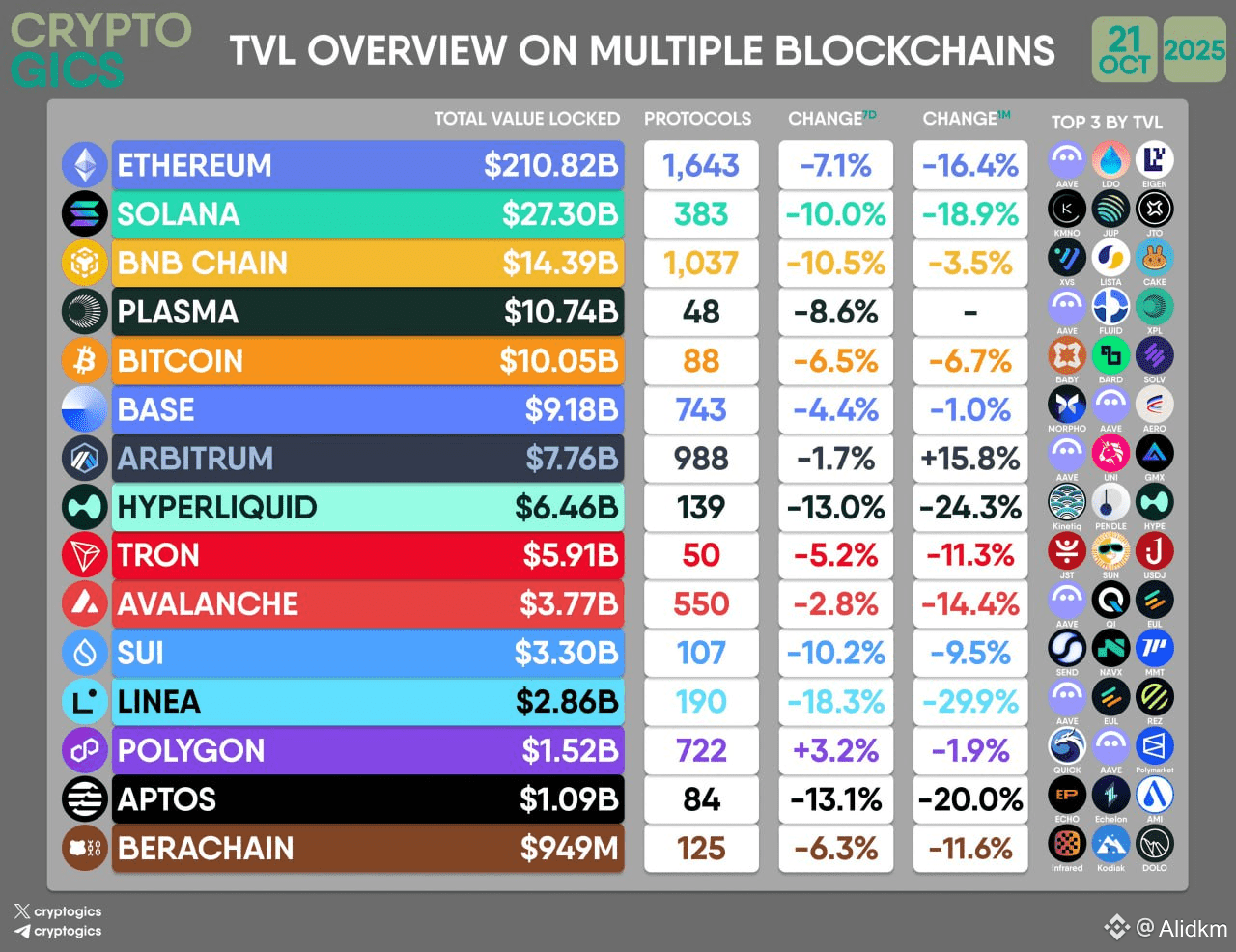 TL;DR: Total Value Locked is cooling across most ecosystems — Ethereum still dominates (~$210.8B) but is down week-on-week and month-on-month. L2s and some alternative chains show mixed signals: Arbitrum stands out with 1-month growth (+15.8%), while chains like Linea, Hyperliquid, and Aptos show steep monthly drawdowns. Overall picture = risk-off capital rotation, selective accumulation opportunities on L2s and protocol-specific winners.