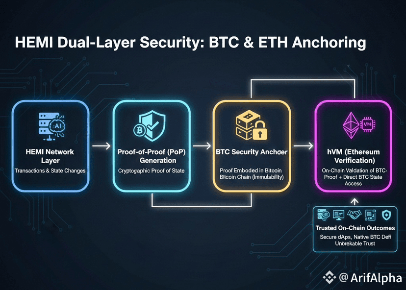 • The BTC Anchor: This crucial proof is then recorded as an immutable transaction on the Bitcoin blockchain. This simple act means that Bitcoin's legendary, 15-year-old security and resistance to censorship now backs the historical state of the HEMI network. Even if an attacker somehow compromised HEMI's own internal validators, the definitive, unchangeable truth of its history is permanently recorded on the most resilient blockchain available.