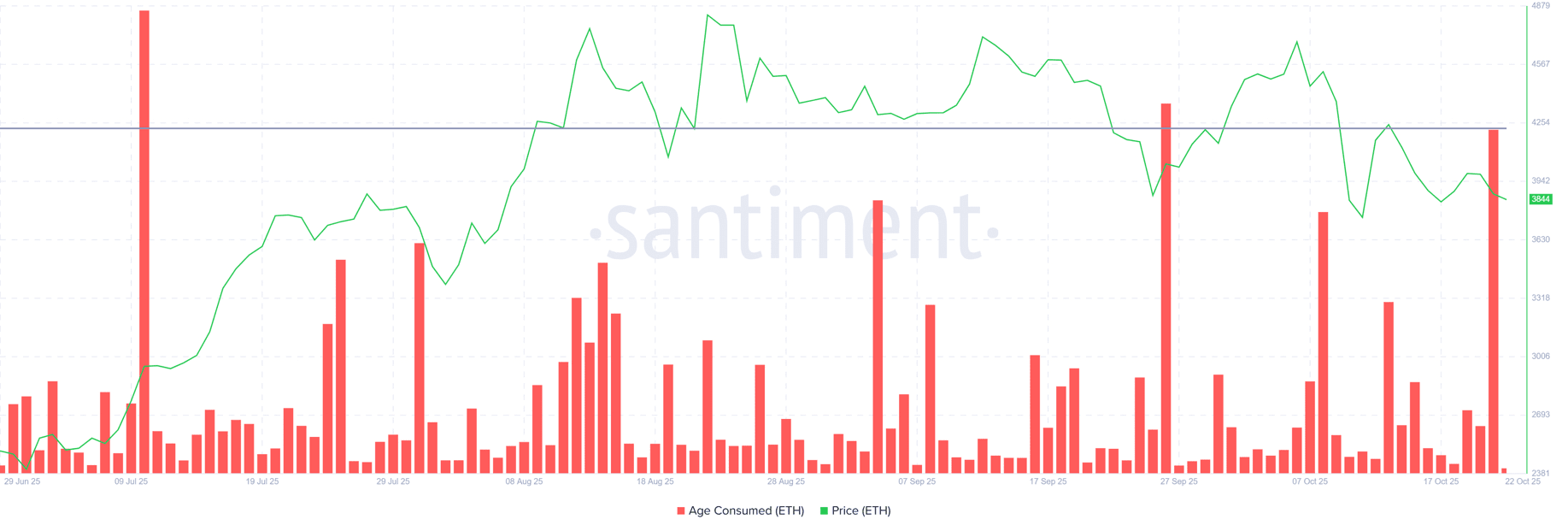 Ethereum on-chain data highlights overall momentum weakness. The consumed age metric - an indicator of dormant coins being moved - saw a significant spike over the past 24 hours. This increase represents the third-largest movement in over three months, suggesting that long-term holders who were previously inactive have started selling their assets.
