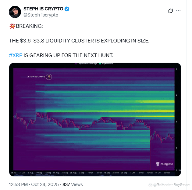 Market analyst STEPH IS CRYPTO recently pointed out a notable surge in XRP's liquidity cluster, describing it as "exploding in size" within the $3.6–$3.8 range.