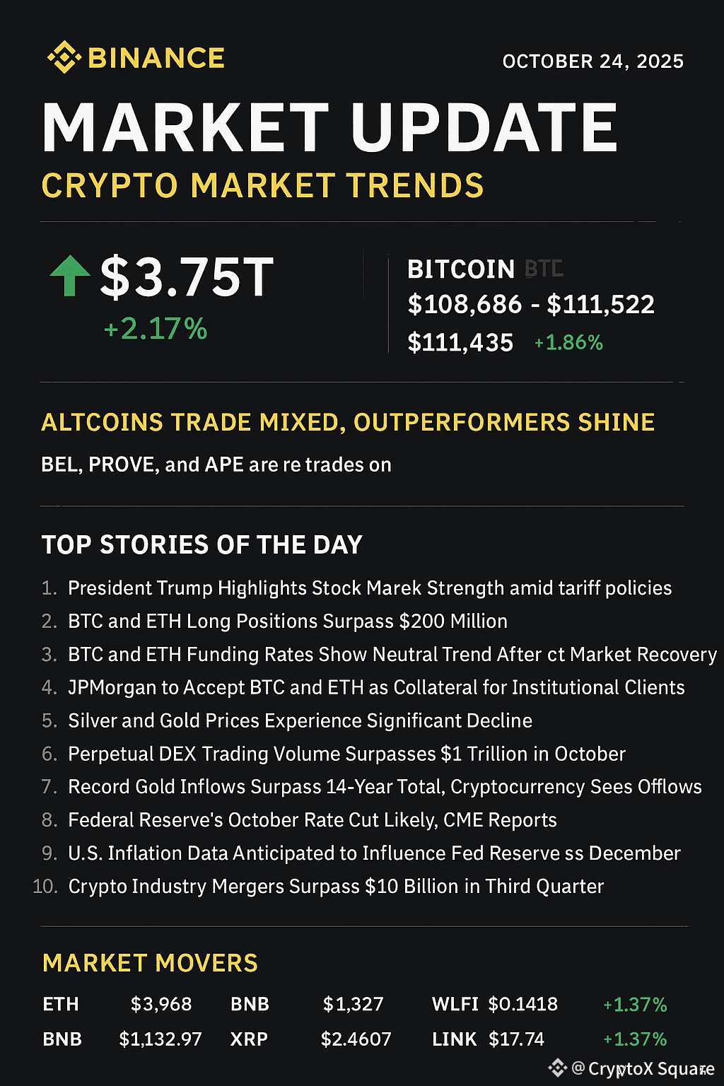 The broader crypto market appears to be regaining its bullish footing, led by Bitcoin’s resilience above $110K and steady inflows into key altcoins like ETH, BNB, and SOL. Institutional adoption—highlighted by JPMorgan’s recent move—combined with improving macroeconomic conditions, could fuel further market expansion in Q4 2025.