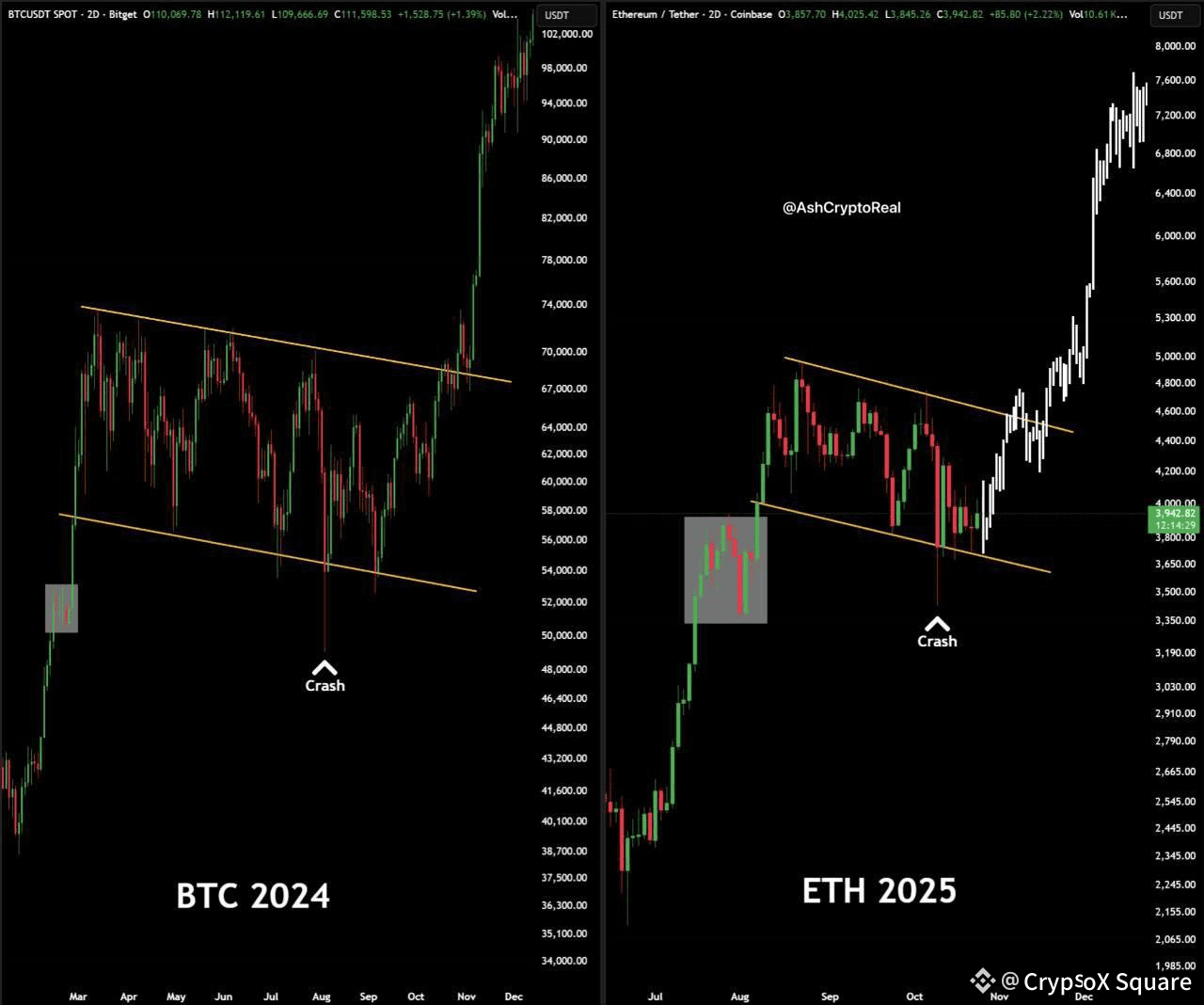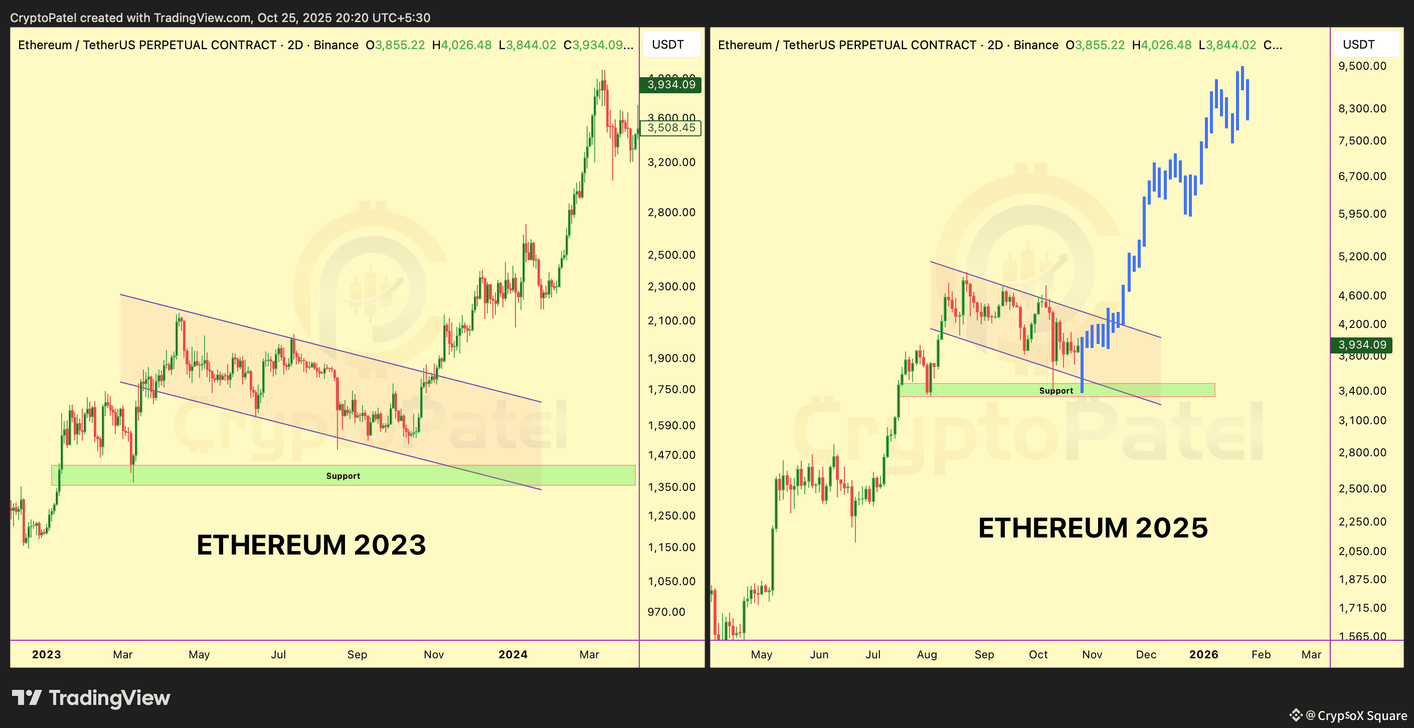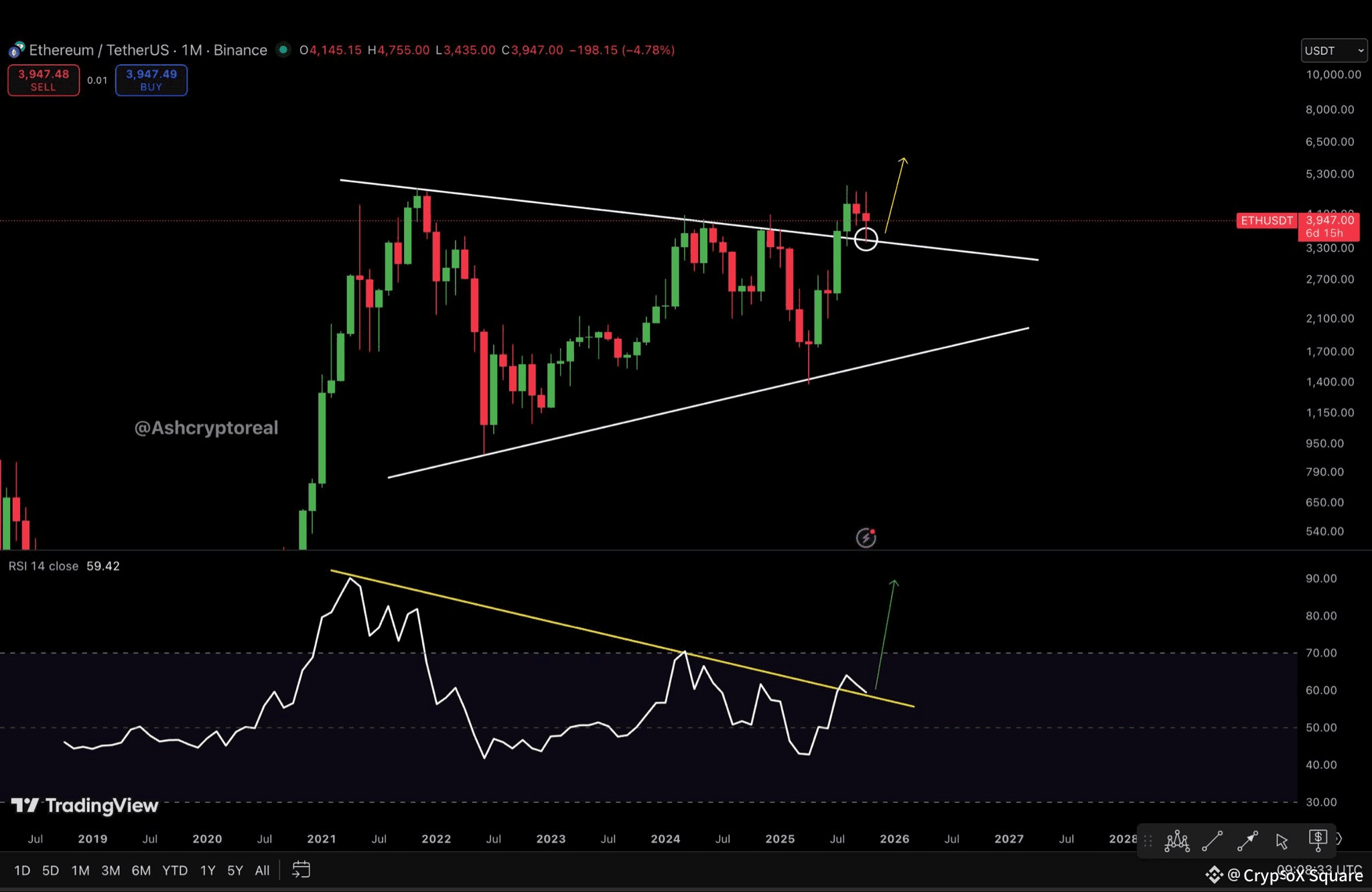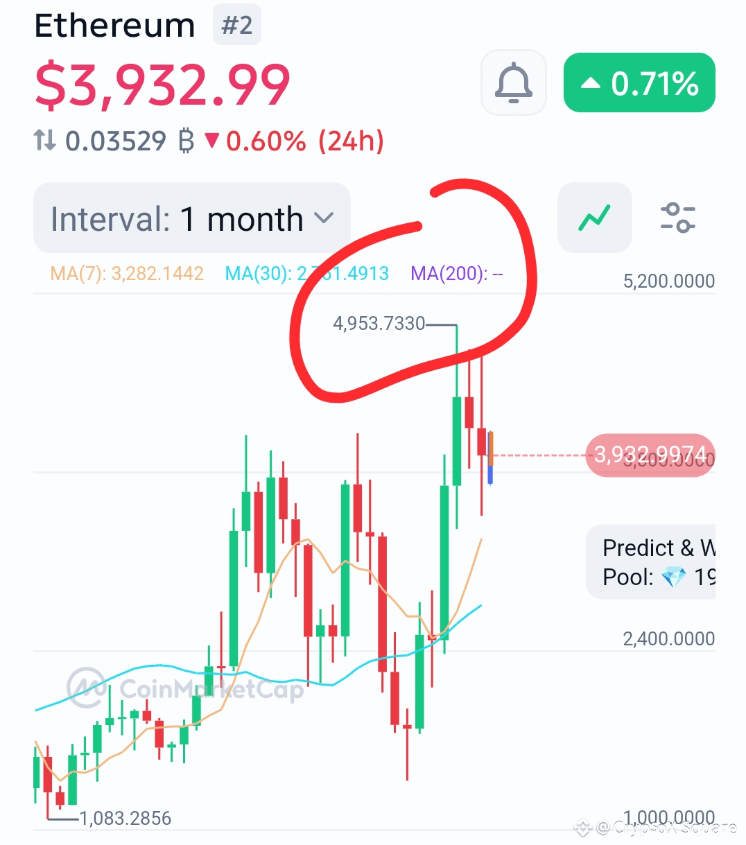 On the one-month chart, ETH has rebounded from the mid-October dip and is grinding back toward $5,000, still below early-month highs — a setup that supports the analyst view of a longer road higher, provided resistance gives way and reclaimed levels hold on subsequent retests.