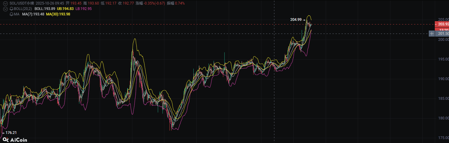 Currently, SOL is continuously forming a trend of 'higher highs and higher lows', which is a typical strong bullish structure. The recent price rise to $205 directly confirms that the bulls have completely taken control of the market.
