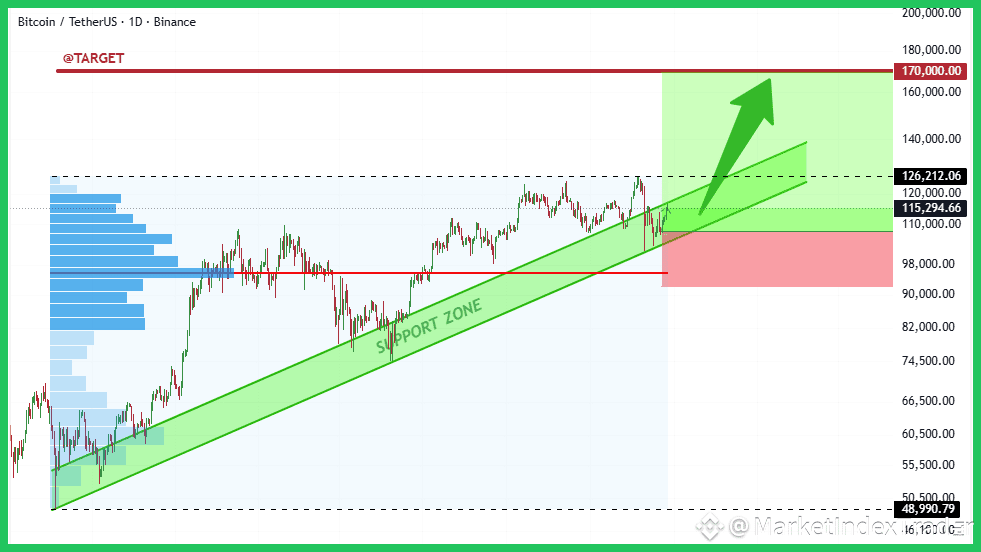 Bitcoin has successfully held the bottom of its key long-term Rising Support Zone (highlighted in green). This confirms strong buying interest below $115,000. We are currently consolidating, eyeing a break above immediate resistance at $126,212. A successful breakout here opens the path toward the massive projected target of $170,000. The invalidation point (Stop Loss) for this trade is marked clearly below $98,000.