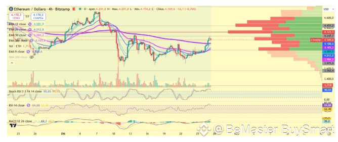According to technical analyst OASIS, Ethereum's 4-hour chart shows price consolidating just below $4,203, where the 200 EMA (around $4,103) intersects with a major volume node. This area has become the key battleground between buyers and sellers.
