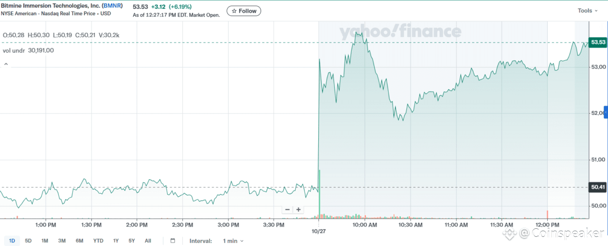 BitMine’s announcement coincided with renewed momentum in its stock. As of Oct. 27, 2025, BMNR traded at $53.48, rising 6.12% for the day after last week’s close at $50.41. The stock averages more than 51 million shares traded daily, with a market cap of $14.79 billion.