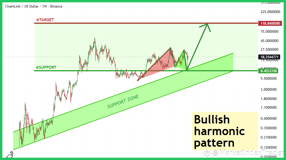 We are analyzing the 1W chart, which highlights a massive opportunity. Price recently corrected but is showing strong potential to reverse near the critical support level of $8.45, completing what the chart identifies as a strong Bullish Harmonic Pattern. This pattern's reversal point rests perfectly on the long-term rising SUPPORT ZONE. The immediate overhead resistance sits around $20. Breaking this confirms the structure is holding, opening the path towards the ambitious long-term target of $118.84.