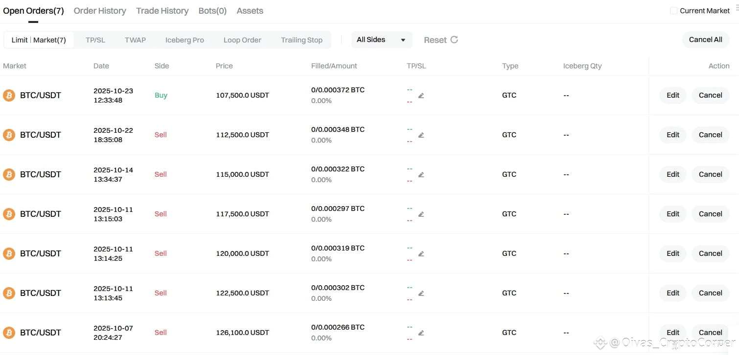 3. I continuously set up the orders in a cycle, taking full advantage of Bitcoin’s price movement between USD 107,500 and USD 126,000 (this was the highest BTC hit recently. I always do this in steps of USD 2,500. You are free to choose your own steps. It could be USD 1,000, 500, or even 3,000. Do what suits you.