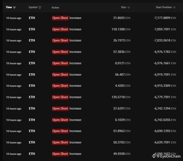 Address 0x218A65E21EDDeeCE7A9Df38C6bBdd89F692B7Da2 opened a short position of 3,464.4 ETH yesterday morning , and later doubled down at higher levels, expanding to 7,199.76 ETH.