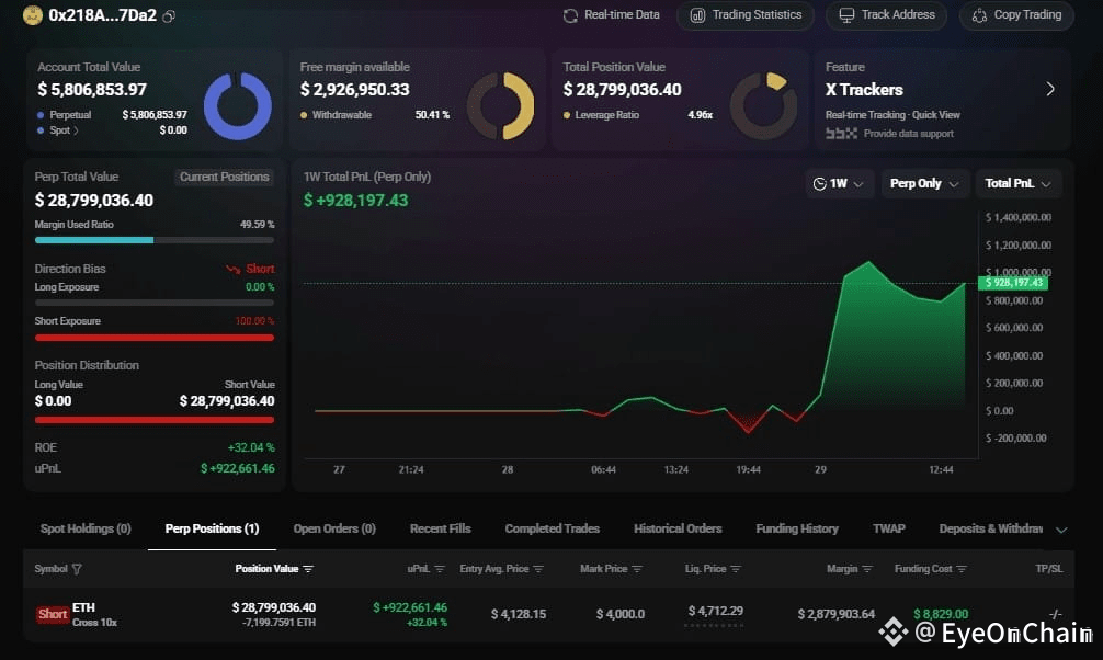 Now holding a short position in #ETH worth over $28.75 million, with an average entry of $4,128.15, this trader is sitting on an unrealized profit nearing $900,000.