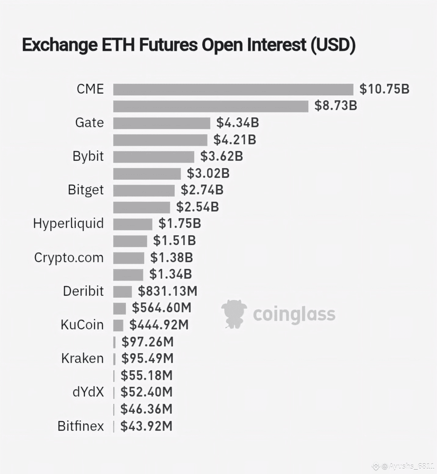 The institutional side is building in silence. The CME currently leads Ethereum’s futures open interest with $10.75B, followed by Gate ($8.73B) and Bybit ($3.62B). Binance, despite its unmatched retail dominance, now lags behind in open interest, a sign that professional traders are positioning elsewhere under regulated structures.