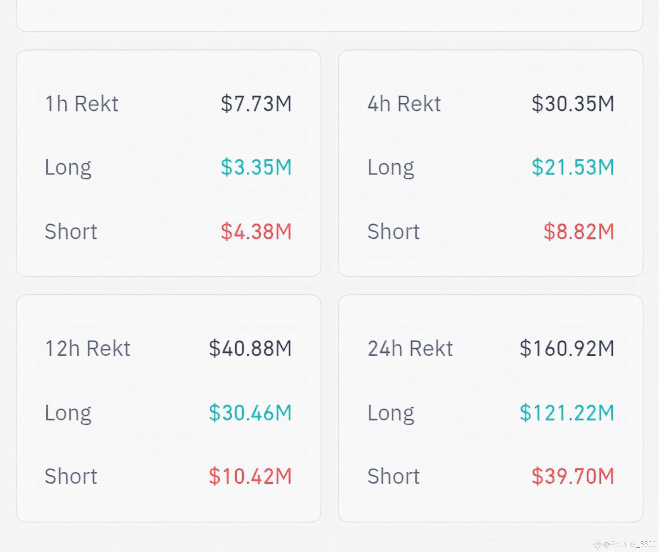 The last 24 hours saw total market liquidations of $160.92M across all exchanges. Out of that, $121.22M came from longs and $39.70M from shorts.