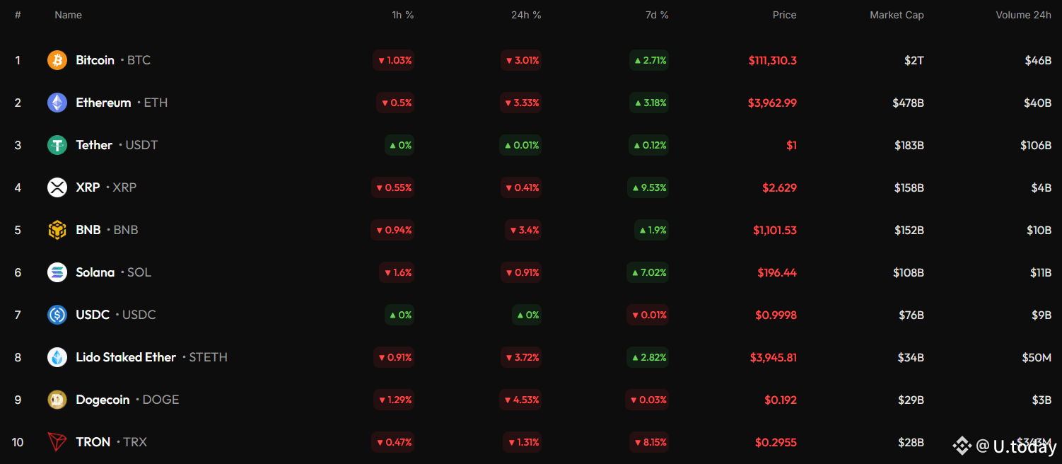 Most of the top 10 coins are in the red area today, according to CoinStats.