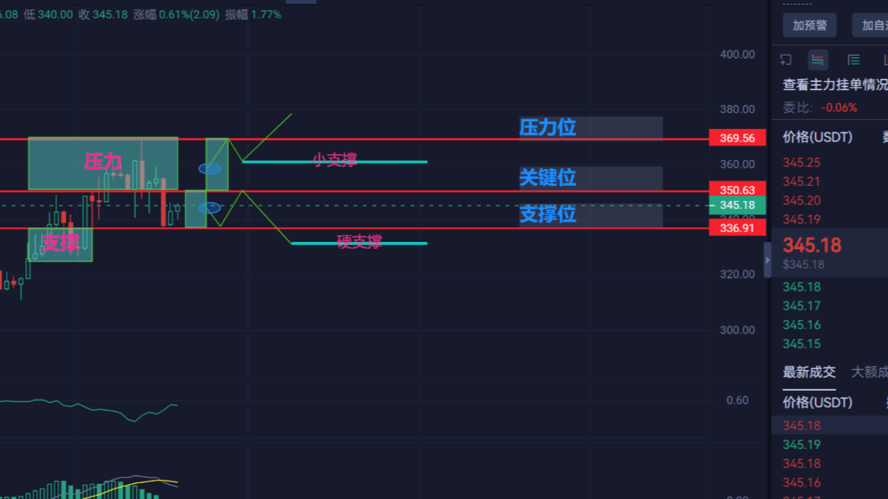 From the hang order data, there are dense buy orders around 345 USD. Although the commission ratio is negative, large transactions are concentrated in the 345-346 range, indicating that substantial funds are quietly accumulating at this position.