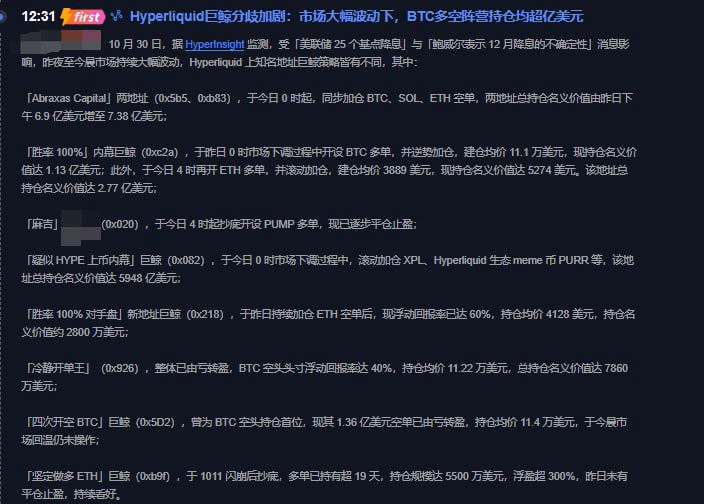 The crypto circle has exploded again tonight! The Federal Reserve just cut interest rates by 25 basis points, and Powell's statement has stirred the market into chaos: 'A rate cut in December is not set in stone.' Stimulated by this news, BTC has been fluctuating around 110,000, and on Hyperliquid, the whales have split into two major camps: 'bulls' and 'bears,' operating fiercely!