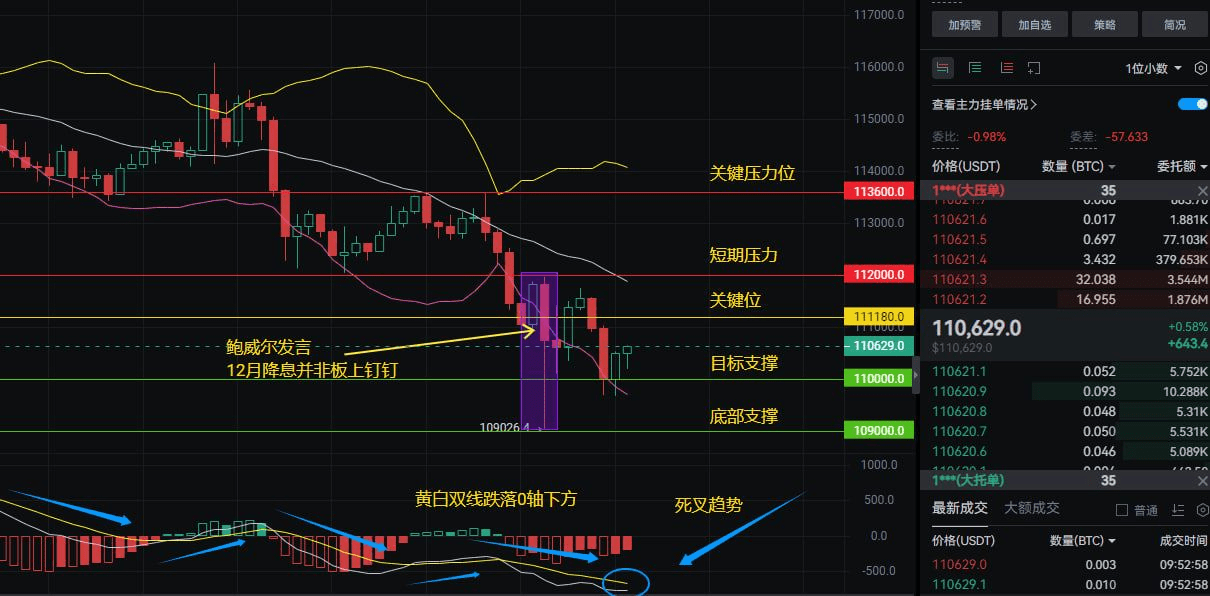 BTC 1-hour chart is more intuitive: the upper resistance at 114000 is strong, 112000 and 111000 are also key levels; the lower boundary at 109000 is the baseline, with support around 110629. Currently, the MACD yellow and white lines have dropped below the 0 axis, showing a clear death cross signal, and the technical outlook is bearish. However, Powell's statement that 'December is not necessarily a cut' has added another layer of market entanglement, with both positive and negative factors twisting together, causing the price to hover around 110000.