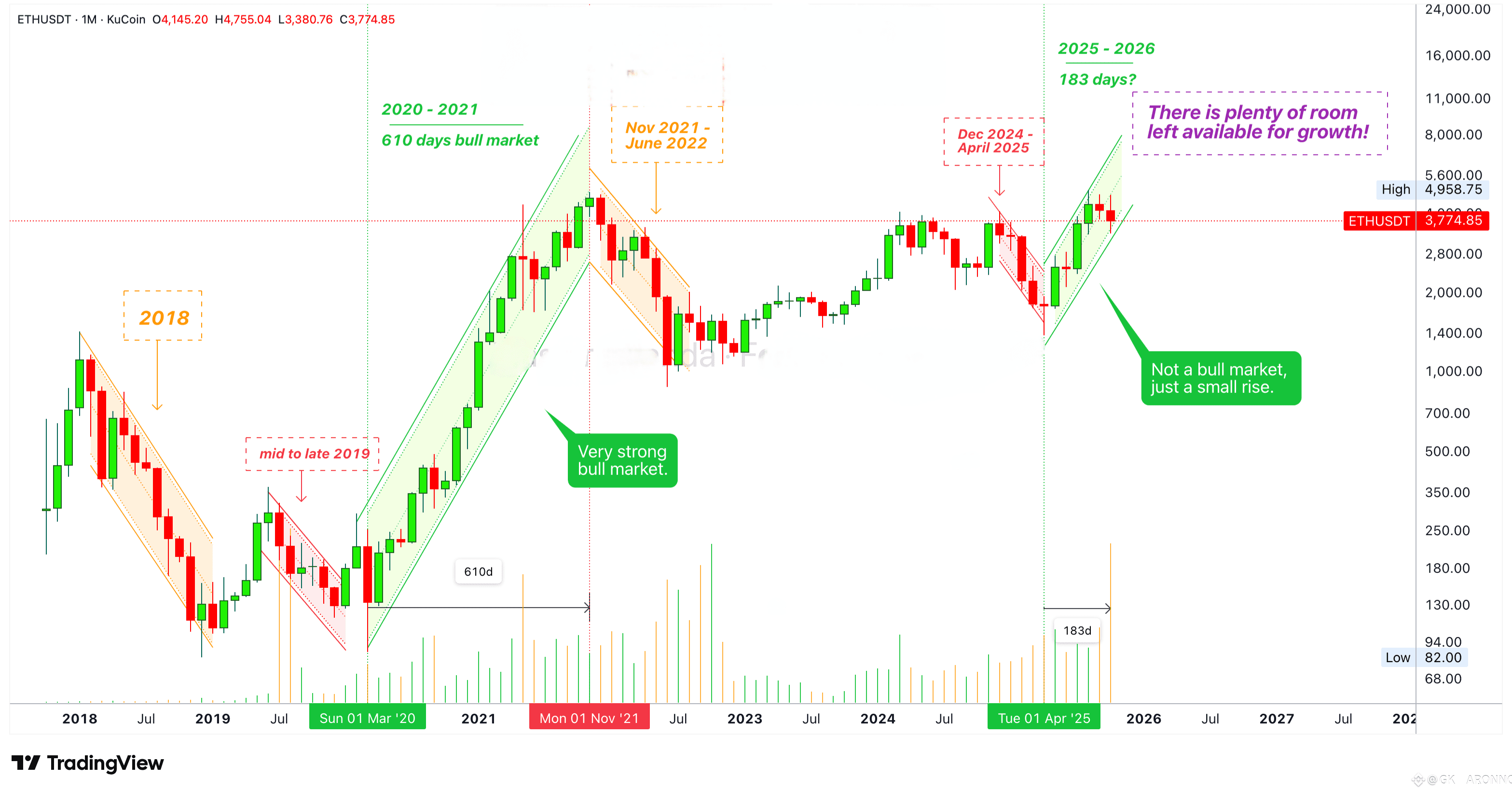 Look at Ethereum now, it started growing after April 2025. The phase before was composed of strong bearish action. Strong bearish action can precede a bull market, totally, but a bull market is a bull market, there has to be very strong growth. We are missing the bull run phase.