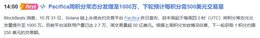Yesterday, the perpetual contract platform Pacifica on the Solana chain made a big move: starting this week, every Thursday at 0:00, the weekly points distribution will be maximized to 10 million! What does that mean? The platform currently has 27,000 active users and a weekly trading volume of over 5 billion. Previously, to earn 1 point, you had to trade $250, but now it has doubled to $500! The platform is clearly throwing money to attract users to earn more points, so trading will definitely increase, and the liquidity on the Solana chain and the demand for SOL will surely rise. With all this activity on the chain, how can SOL not benefit from it?