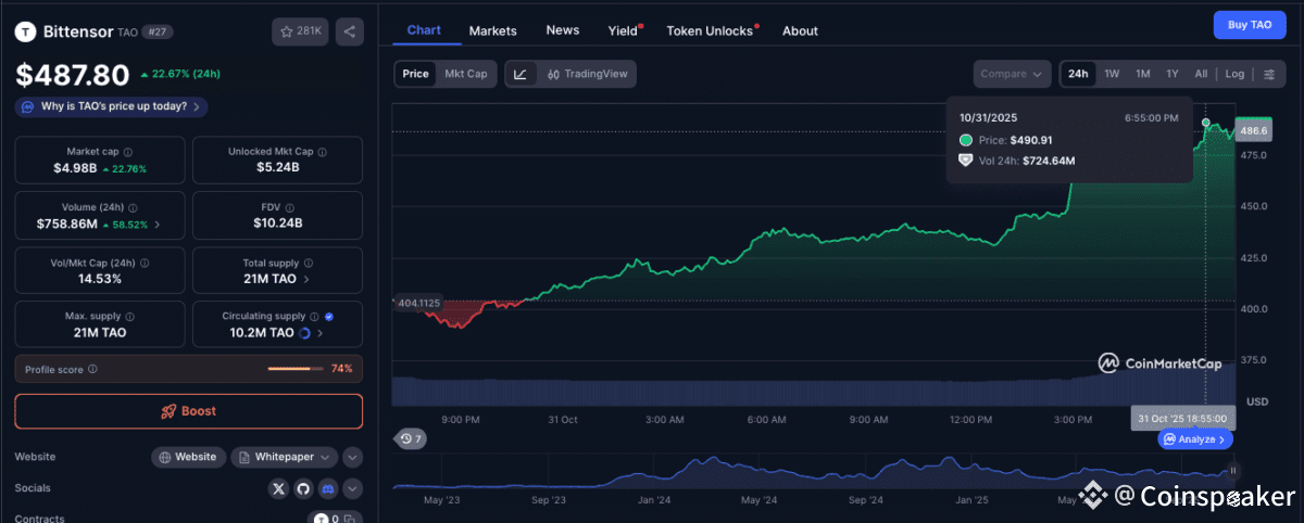 Bittensor (TAO) price rallied 20% on Friday, October 31, climbing from $414 to $490 after the debut of Europe’s first staked TAO exchange-traded product (ETP).