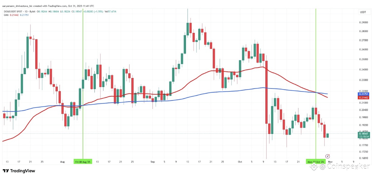 This crossover occurs when the 50-day EMA drops below the 200-day EMA, confirming weakening upward momentum. The development suggests Dogecoin could be increasingly vulnerable to broader market downturns. As investor confidence softens, analysts warn of rising volatility that may further pressure the asset’s price.