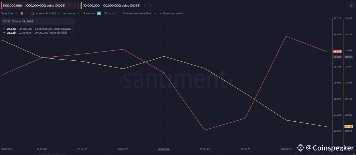 Notably, addresses holding between 10 million and 100 million DOGE began reducing their positions on October 27, offloading about 800 million DOGE.