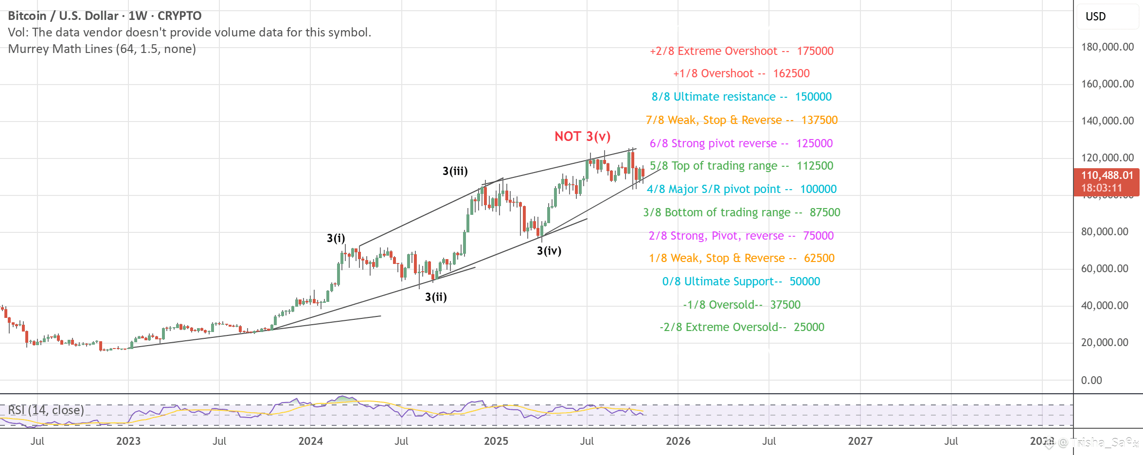 On weekly charts, the current top of 124k coincides with 1.236 of wave 3(iii) and as per Murrey Math's 8 line theory, 1.236 is a powerful zone for reaction with 1.00 levels acting as support, which is very clear on weekly charts. In such scenarios, the final target is typically at 1.618 levels of 3(iii) which stands in 140ks.