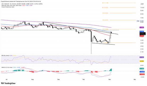 Internet Computer is trading above $4 at the time of writing this report on Monday, after a gain of 24% on Sunday. The rise of the ICP token exceeds a local resistance line formed by connecting August 13 and October 5.
