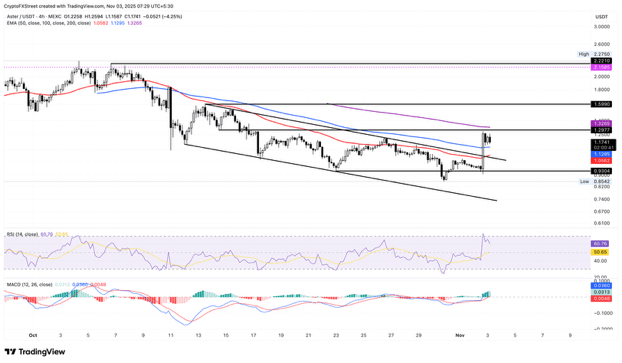 The breakout movement of Aster's descending channel on the 4-hour chart, spurred by a 27% rise on Sunday, is struggling to surpass the resistance level at $1.29. At the time of writing this report, ASTER has declined by over 4% on Monday, exposing it to a pullback to the support level at $0.93, defined by the low on October 23.