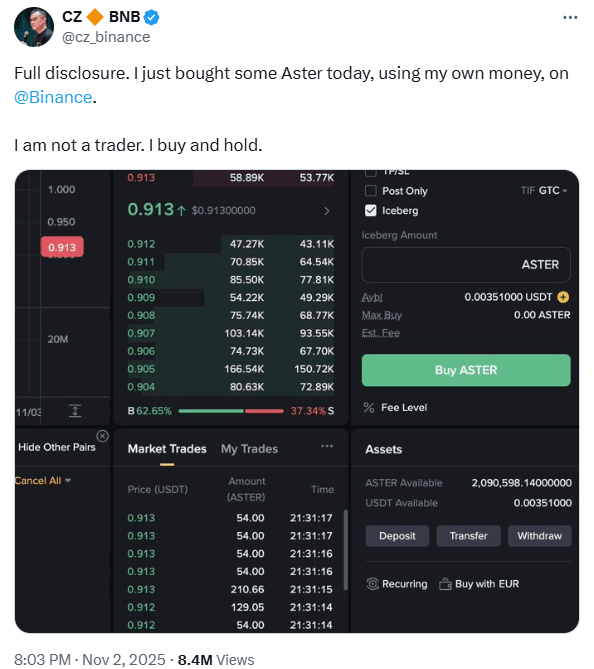 After CZ's post, whale groups pumped the market to accumulate 80 million new tokens, and the ASTER index saw a crazy jump of 27%, surpassing $1.25. This was the catalyst they needed to create a false peak.