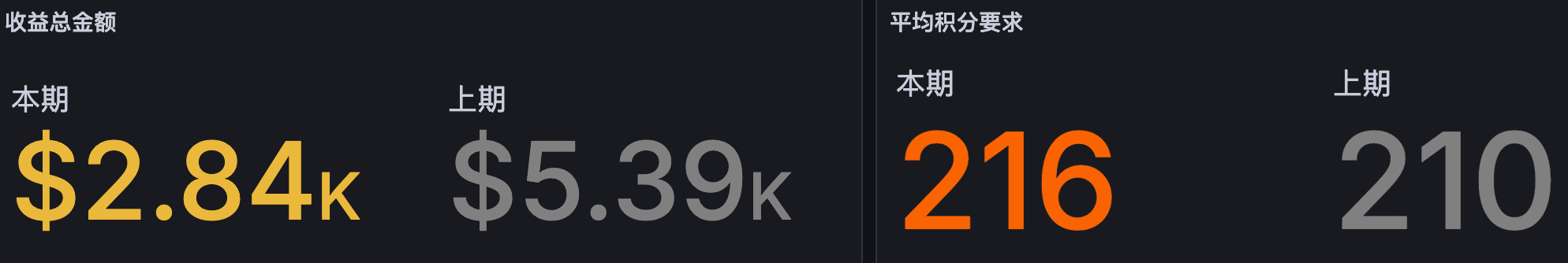 Total amount (counting all airdrops, ordinary users can take around 8/46) 2840 U, which is about half less compared to September. On average, each issue is only 3/5 of the previous one. In reality, if you didn't get $2z, your average amount might only be 50U. Additionally, the score has increased by 6 points, with more costs and less profit. It is speculated that the profits in September were too explosive, and a large number of new users flooded in after the National Day return to their hometowns.