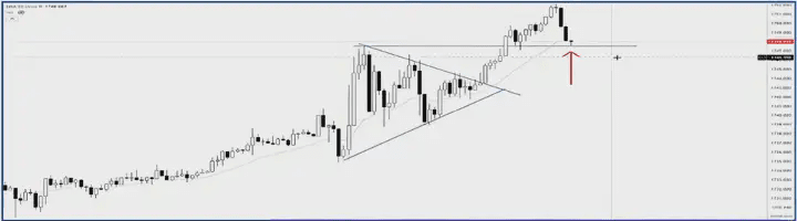 Now we need to find an entry logic, an entry pattern. When the price moves to this point, it shows a triple engulfing candlestick pattern. This triple engulfing pattern is within a converging range on a shorter timeframe. Since it's a converging range, we can trade its breakout. If it breaks down, it perfectly fulfills a shorting logic. At the same time, this candlestick also retests the previous breakout point, a support/resistance exchange confirmation point. This adds another reason to short. Therefore, when the price breaks below the low of the triple engulfing candlestick, it's a good entry point.