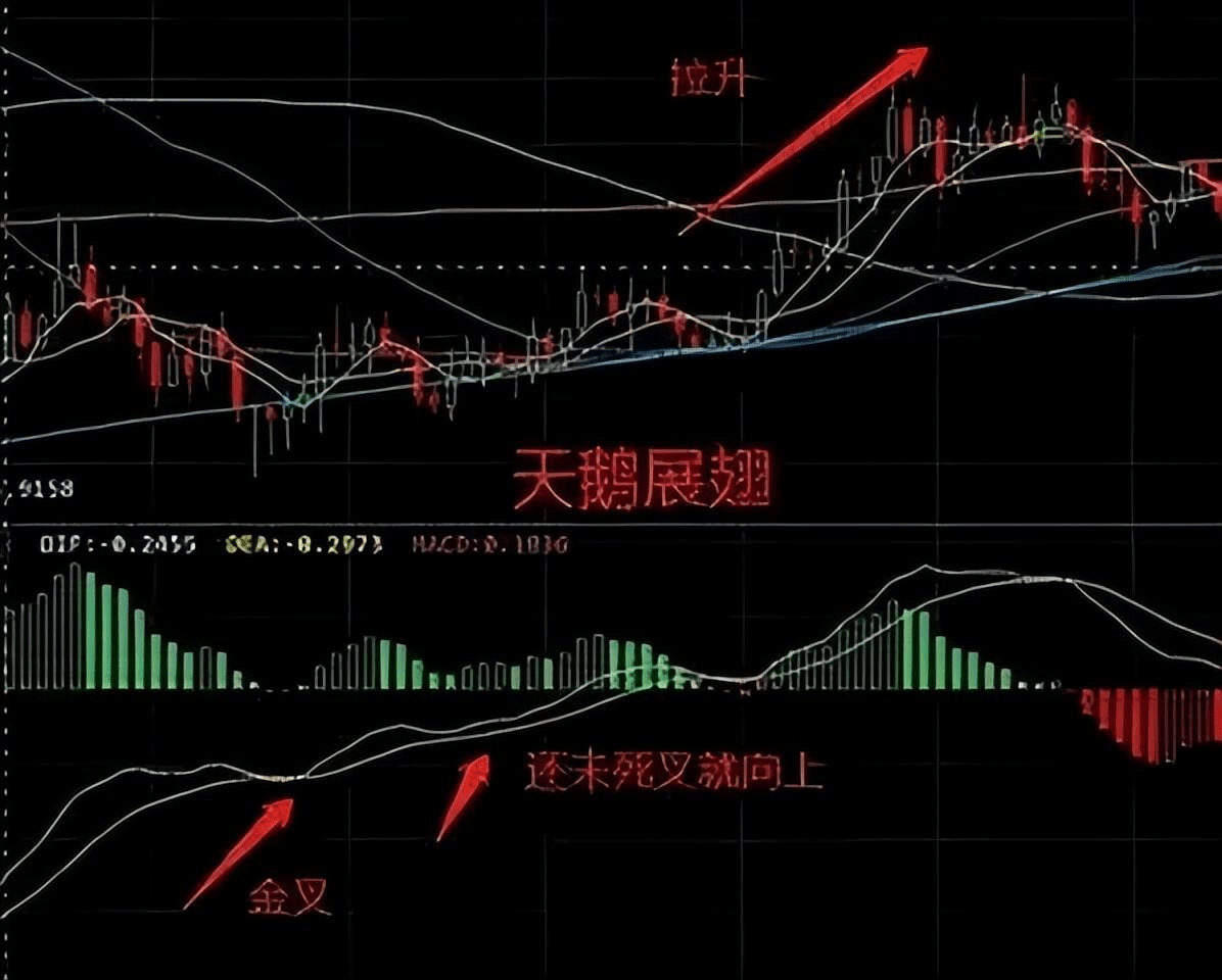 (4) Swan spreading wings: The fast line forms a golden cross with the slow line below the 0 axis, but does not cross above the 0 axis before correcting, approaching the fast line. The MACD green bars shorten, but there is no dead cross with the slow line; it then reverses upward again, while also extending the MACD green bars, forming the swan spreading wings shape.