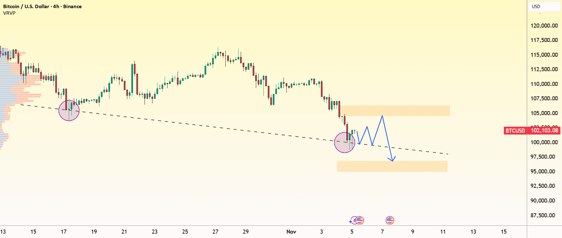 On the 4-hour chart, the bearish structure remains dominant. The price continues to move within a descending channel, where the $104,600 area now acts as crucial support in the short term. Every bounce has been swiftly rejected — a clear sign that the market is not ready for any meaningful recovery yet.
