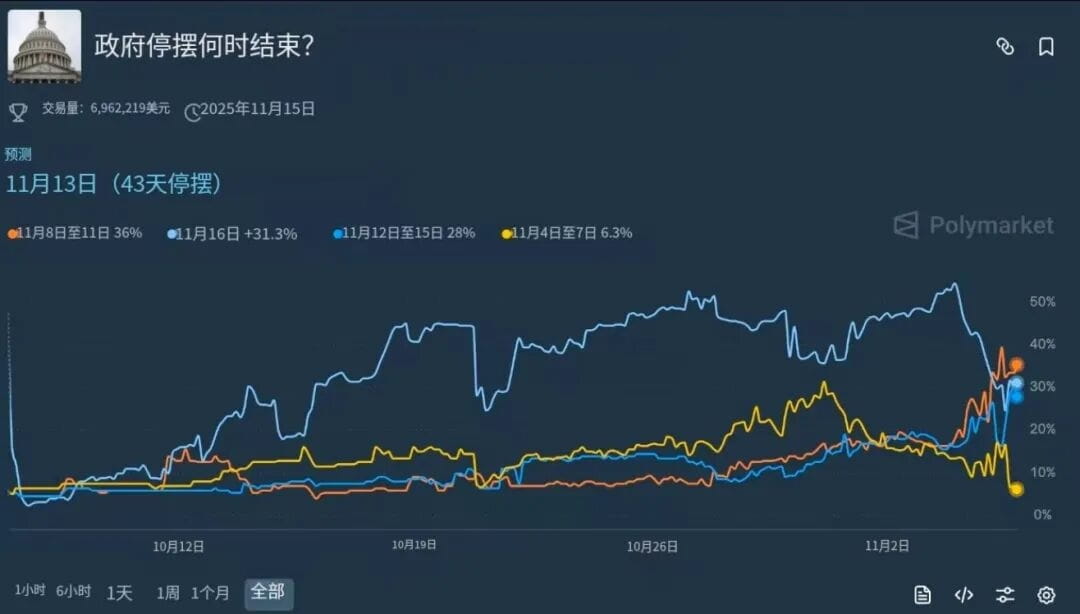 On the Polymarket platform, the proportion of bets on 'the shutdown ending between November 8 and November 11' has surged from 22% last week to 36%;