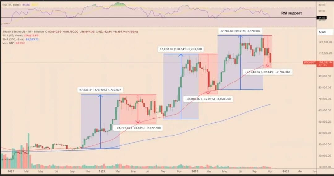 As long as BTC stays above the key lines of the 200-week EMA and RSI, the overall bullish structure remains intact; conversely, if both are lost, it means the market may enter a deeper bear market adjustment.