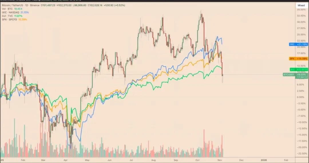 This decline is not an isolated event. With AI concept stocks plummeting, the overall market risk appetite has decreased, and risk assets have generally faced a correction. According to The Kobeissei Letter data, Bitcoin has seen a cumulative correction of about 20% since reaching an all-time high on October 6, officially entering a technical bear market range.