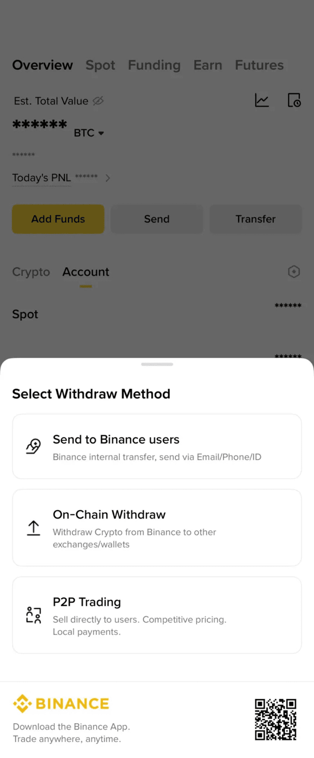 Click the 'Send' button to start the withdrawal process, then a window will appear to choose the withdrawal method.