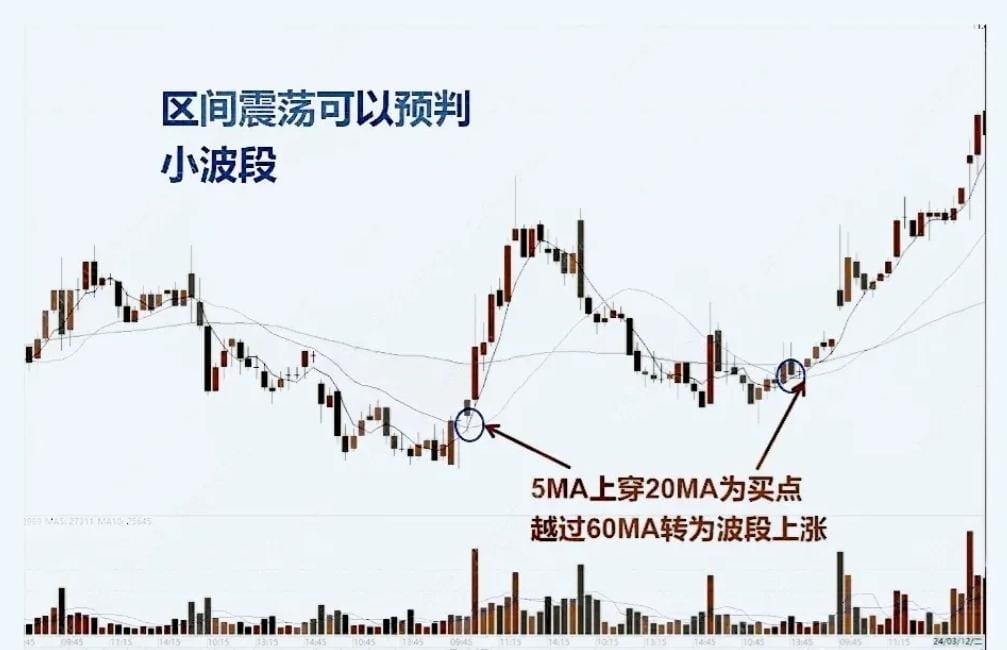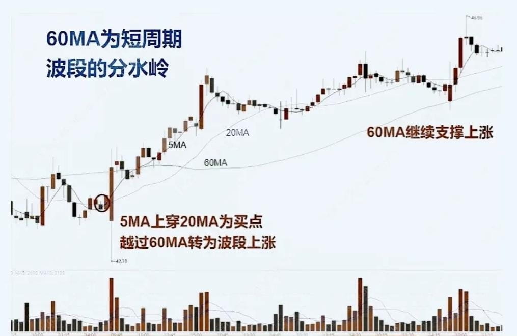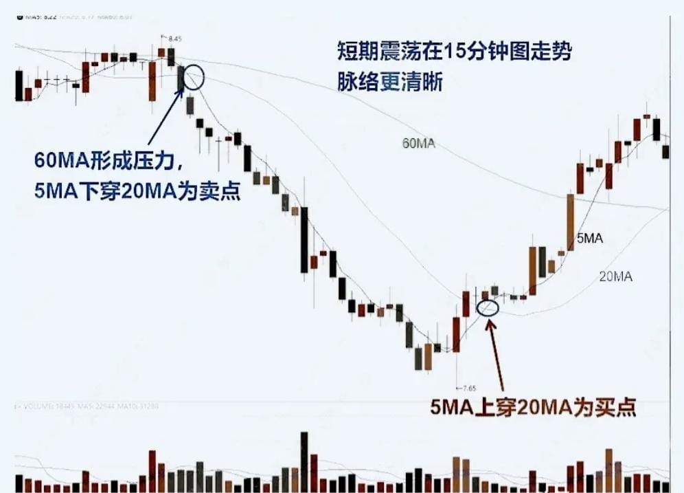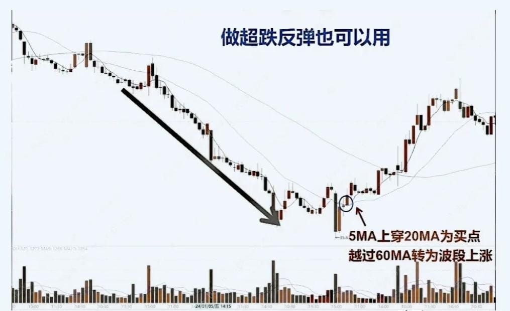 A. A method using moving averages, you set a 21-day moving average and a 5-day moving average on the 15-minute K-line chart. When you see the 5-day line crossing above the 21-day line, that is a buying signal; there are two selling methods: generally, when you see the 5-day line crossing below the 21-day line, you must decisively leave; in special circumstances, if the daily KDJ's J value of that stock reaches 100, and you see the stock price below the 5-day moving average, you can consider selling and leaving. However, if the 5-day moving average crosses below the 21-day moving average, you must leave decisively.