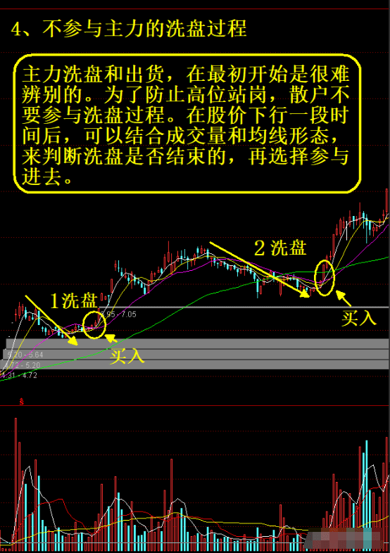 When the stock price starts to decline, it is hard to distinguish whether the main force is washing or unloading. To prevent standing guard at high positions, retail investors should not participate in the washing process. After the stock price declines for a while, one can judge whether the washing is over based on trading volume and moving average patterns before deciding to enter!