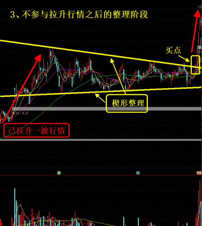 Common consolidation patterns include triangular, wedge, and flag formations. This is a common trend after the main force has pushed up a wave. During this stage, the main force needs to digest profitable chips, lower holding costs, and redeploy funds, which takes time. Not participating can reduce time costs and avoid wasting many opportunity costs.