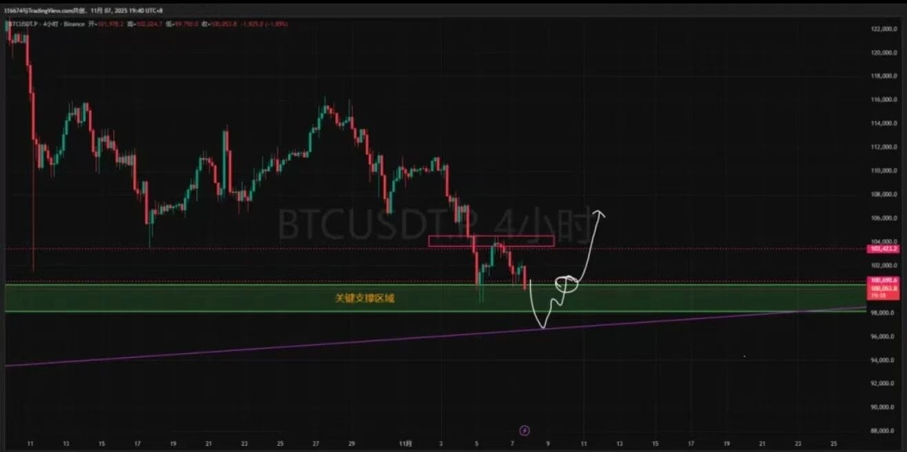 Long position idea: If BTC recovers above 100,700 after touching the trend line, that would be a great long entry point. Friends worried about missing out can consider accumulating longs around 100,000-97,000.